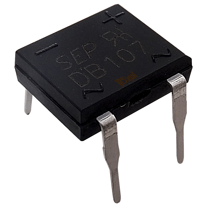 پل دیود DB107 از چهار دیود داخلی تشکیل شده و توانایی یکسو کردن ولتاژ AC تا 1000 ولت پیک (Vrms 700V) را دارد. جریان نامی آن 1 آمپر است و به دلیل کیفیت ساخت برند SEP، از پایداری، مقاومت حرارتی و افت ولتاژ مناسب برخوردار است.